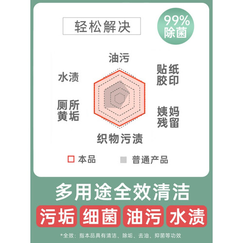 多用途清洁,可祛除水垢、尘污、油渍等。温和配方,抑菌率高达99%,不含金属腐蚀性,无重金属和甲醛成分,使用更放心。