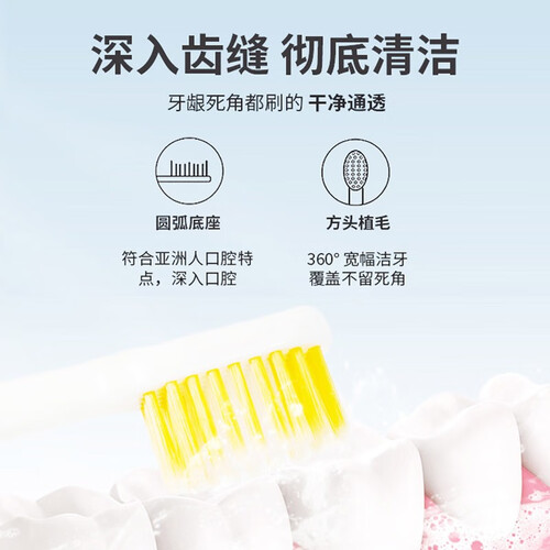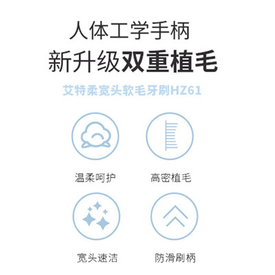 采用加宽的刷头设计,结合新升级的双重植毛,提高清洁效率,牙齿刷得更干净。刷毛经过八重物理磨圆,可按摩牙龈。