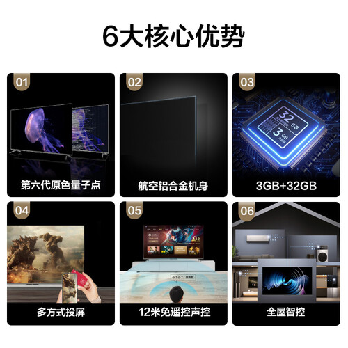 第六代原色量子点,色彩饱满有层次,画面清晰不失真。DTS音效后处理技术,优化声音质量,媲美身临现场体验。