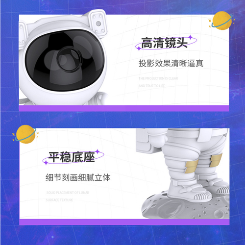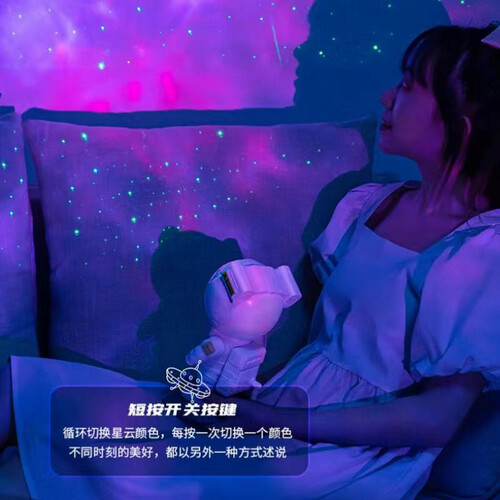 宇航员造型简约时尚,风格百搭,即是精美家居点缀,又是梦幻投影灯。夜幕降临时,星光和星云布满卧室,让夜晚充满浪漫和静谧。