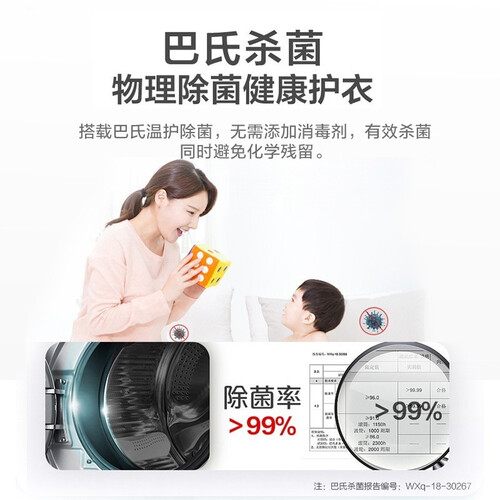 空气洗科技,微蒸汽循环穿透纤维,不用水洗也能清洁衣物。纤维级柔烘,变温烘干衣物,呵护娇柔面料。