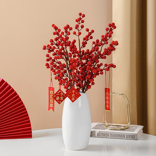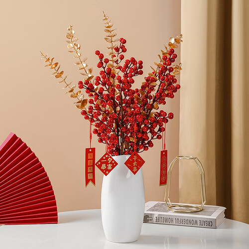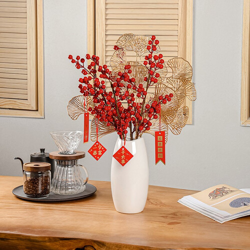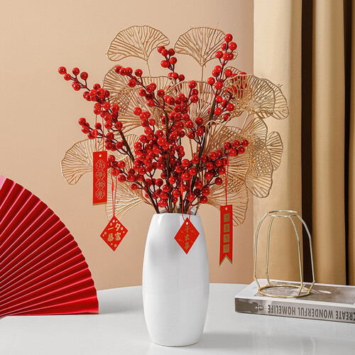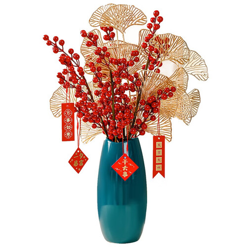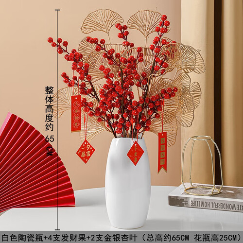 以仿真的发财果装饰,果实粒粒饱满,颜色过度自然,搭配金色的银杏叶,更显轻奢范,不管摆放在哪里都是亮点。