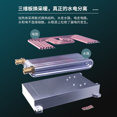 采用三维板换采暖,实现水电分离,避免漏电现象,淋浴更放心。结合二级防冻科技,避免内部余水结冰,寒冬也能正常运行。