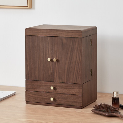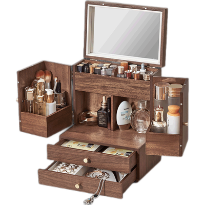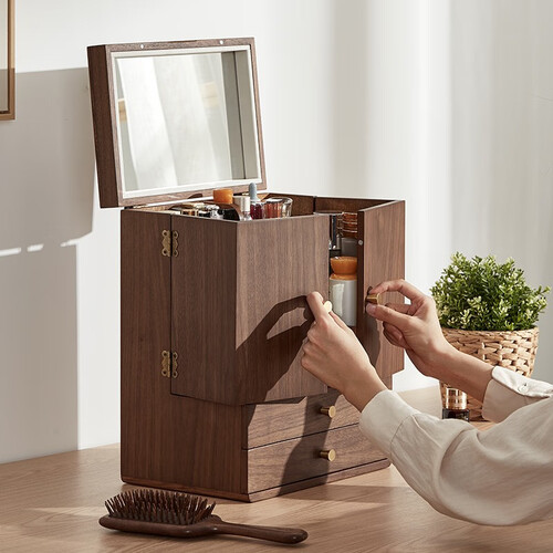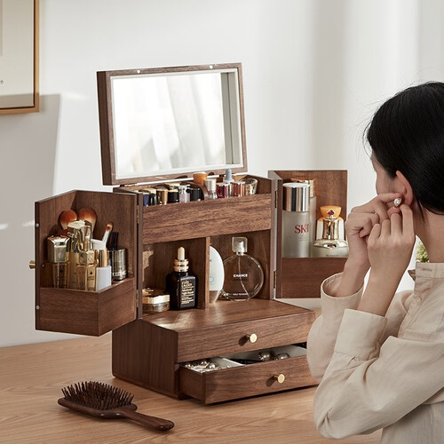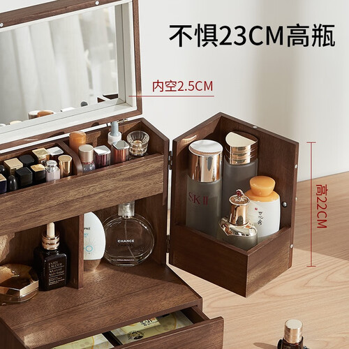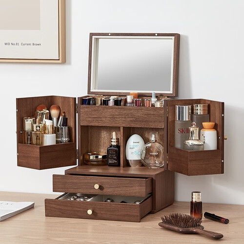 大容量的设计,各区分类存放,收纳更细致。采用厚实的板材制作,搭配胡桃木的纹理,尽显美观大气。高清成像的化妆镜,清晰上妆无色差。