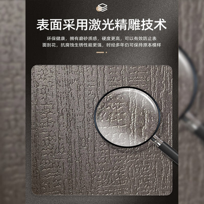 融合激光精雕技术铸造的甲级家用防盗门,呈现出高级磨砂质感,能有效防止刮花。加上镂空品牌标识篆刻,沉稳大气细节感满满。