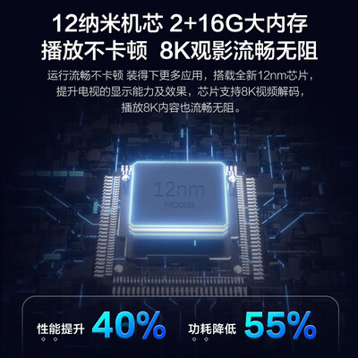 98%高屏占比,打造无边视界,身临其境的沉浸观感。搭载12纳米强劲机芯,支持8K视频解码,播放顺畅。