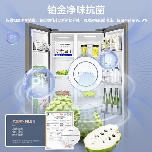 采用360度立体风冷循环设计,可带来更均匀的制冷效果,保鲜持久不结霜。内置铂金净味装置,拥有高达99.9%的抗菌率。