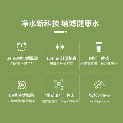 124mm纤薄机身+无罐设计,安装不占地,为整个橱柜预留大量存储空间。24小时实时水质监测,喝水安全更具保障。