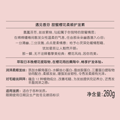 清新甜蜜的樱花香气,持久萦绕发丝,香气经久不散。搭配氨基酸成分,有着良好的控油效果,令秀发蓬松柔顺。