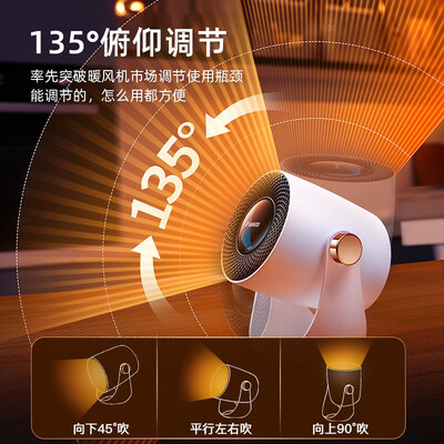 采用7片仿航空涡轮扇叶设计,可实现5米远距离送风,满足大面积取暖需求。采用360°空气对流循环原理,全屋升温更均匀迅速。
