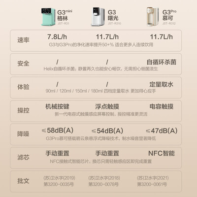 灵巧的机身搭配轻奢的颜色,可以放在家里、办公室等多种场景中。采用反渗透技术,保证用水安全,拒绝重金属的污染。