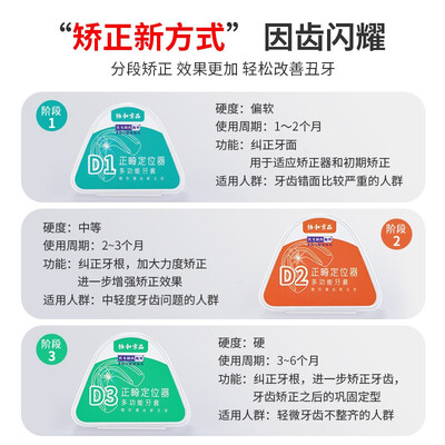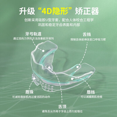 升级4D隐形矫正器,符合人体咬合工程学,帮助巩固稳定牙齿表面和内部。食品级橡胶材质制作,可以清洗反复使用。
