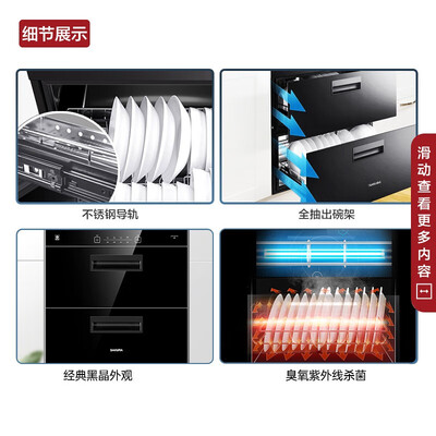 双层分类空间设计,用时除菌,闲时收纳,合理储存餐具,清洁又卫生。腔外导轨设计,告别内置,长效净护无二次污染。