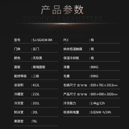 采用黑色玻璃面板设计,经典大方,能够轻松融入多种家装风格。搭载PCI净离子群主动净化技术,可快速消除箱内异味。