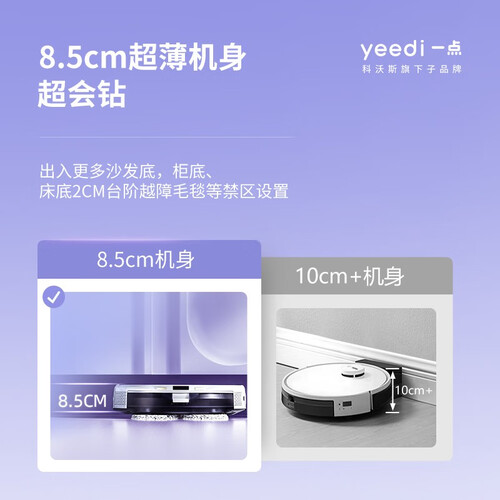 拥有超薄机身,各类家具底部可自由出入,清洁更彻底;4挡吸力按需调节,轻松实现清洁需求;拥有超广角视觉导航系统,实力避障。