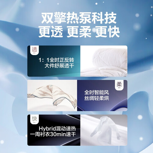 双擎热泵烘干,衣物速干更省时。支持洗烘联动,一屏智控更加方便省心。UVC除菌、高温烘干除菌、负离子除菌三重防护,更健康。