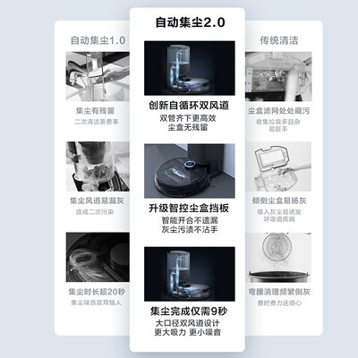 全新自动集尘2.0设计,可以自主收集灰尘;舒适静音马达的采用,运行噪音更小更安静;第五代LDS激光传感器,感知范围精准。