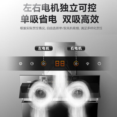 内置双电机,同时开启让吸力瞬间加倍,双灶爆炒油烟不扑面。左右电机可独立控制设计,自由选择,满足多样化烹饪所需。