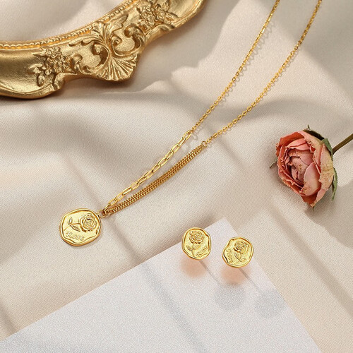 以玫瑰为设计元素,寓意满满,寄托对爱情和生活甜蜜美满的期望。AB链设计彰显个性,INS风的不规则圆币加上玫瑰图案,尽显复古韵味。