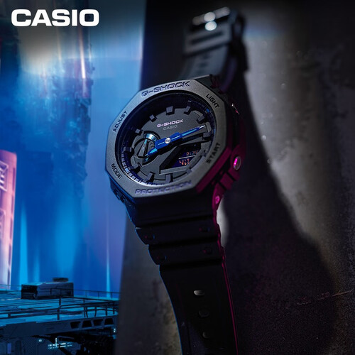 整体以黑色为主调,覆盖迷幻的霓虹配色,未来都市街头光影不彰自显。继承八边形表壳设计,搭配圆形刻度盘,展现简约时尚型格。