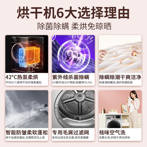 以42℃热泵柔烘衣物,不伤衣物纤维,同时更加蓬松。采用UV紫外线360°照射,能够有效去除衣物中的有害病菌。