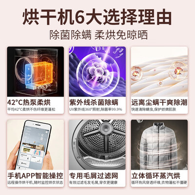UV紫外线全效除菌,快速干衣更护衣。一键深层除螨,呵护宝宝娇嫩肌肤,衣物穿着舒适更安心。42℃低温柔烘,呵护衣物纤维柔软度。