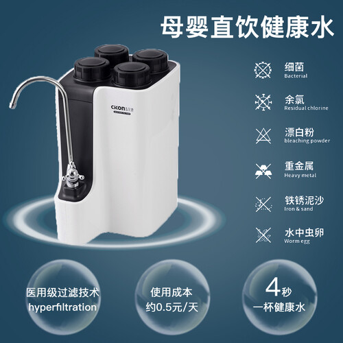 第五代过滤,采用超精细滤芯技术,0.01微米过滤,直饮更安心。1000L额定总净水量,足够三口小家喝五年,总净水量大。