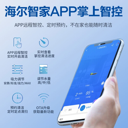 拥有4500帕飓风大吸力,提高清洁效率,缩短清洁的时间。可连接手机APP进行操控,轻松实现远程控制,带来方便的使用体验。
