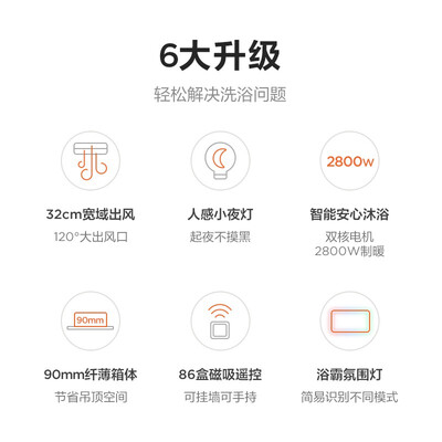 采用32cm宽域出风结构设计,拥有快速升温的效果,散热更为均匀。配有人感小夜灯,晚上起来更省心。纤薄箱体结构,有效节省吊顶的空间。