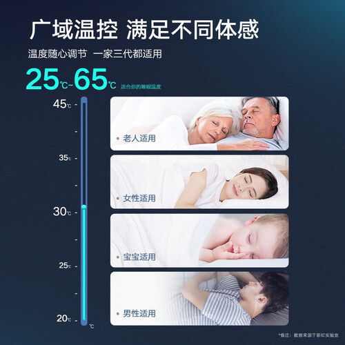 以水传温,让你整夜温润不干燥,毯体无电流,让你舒睡更安全。广域控温,满足不同体感,温度随心调节,一家三代都适用。