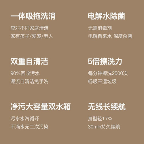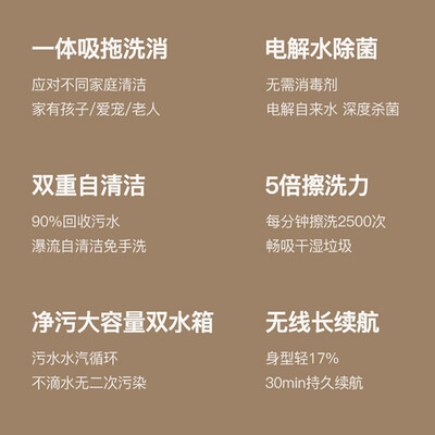 新增电解水模块,提升除细菌率,拖洗干净不易残留。每分钟擦地达到2500次,去污效果强,快速带走表面污渍。