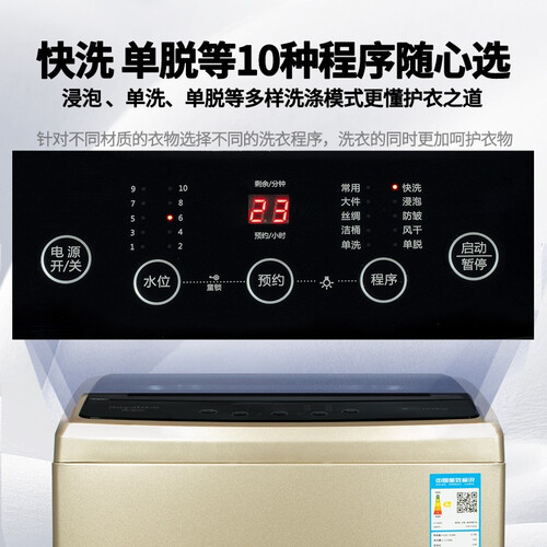 采用钢化玻璃上盖设计,通透明亮,洗衣过程清晰可视。搭配金色彩钢箱体,大气美观,百搭生活空间,久用不过时。