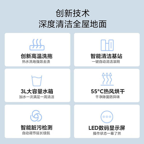 全程水路自带清洁功能,使用1秒钟,自动清洗滚刷15次,减少二次污染。内置55度热风烘干功能,无需拆洗即可完成晾晒。
