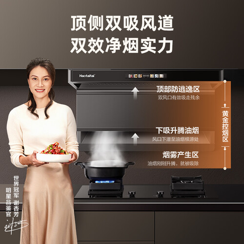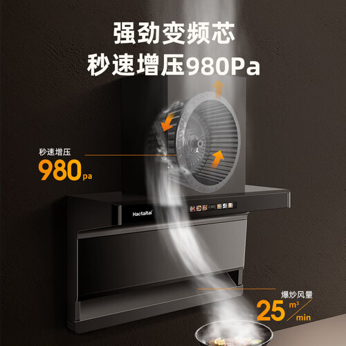 内置品质铜线电机,拥有变频运行技术,动力强排烟快捷。六键的彩色屏幕,功能模式一目了然,夜间也能清晰识别操作。