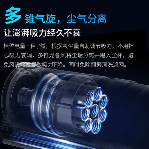 配备11.5万转数码无刷电机,具有强劲动力,能提升性能。多锥气旋,尘气分离,具有强劲吸力,没有吸力衰竭情况。