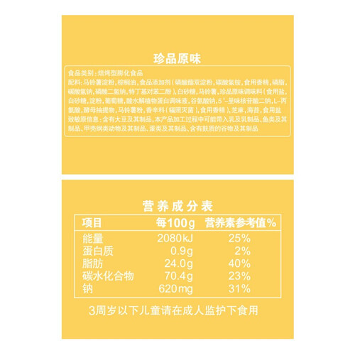 精选优质土豆,光照充足,糖分丰富,造就软糯甘甜口感。先进的烘焙工艺,薯片更酥脆,入口更舒爽。