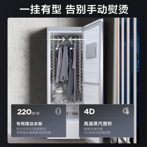 内置可摆动衣架,衣服挂置开启蒸汽能够抚平衬衣褶皱,免去主妇手动熨烫衣服。支持循环温热烘干功能,衣物干爽无惧梅雨天。
