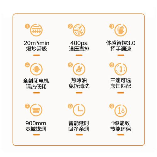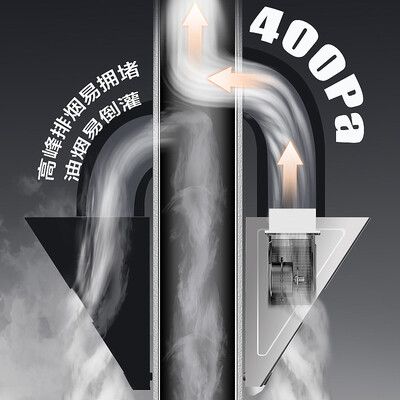 400Pa强压直排,即使在高峰期使用,也不会发生油烟倒灌的情况。智能延时关机,可以将油烟彻底排空,不会留下残余。