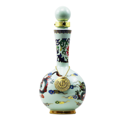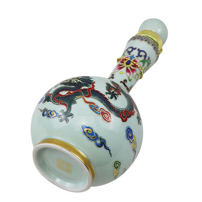瓶颈纤长,搭配球形瓶身更有复古风格,瓶体绘有腾龙图样,彰显古典气质。自带金色装饰品,增添质感。