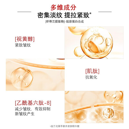 含有视黄醇和肌肽成分,减少细纹的同时抗氧化修护肌肤,紧致肌肤,修护受损肌,令肌肤Q弹水润。
