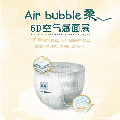 6D空气感面层,触感柔软细腻,不给宝宝肌肤增添负担感。透气PE底膜,快速排走闷热,舒爽不闷热呵护娇嫩肌。