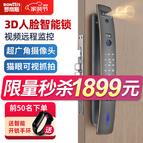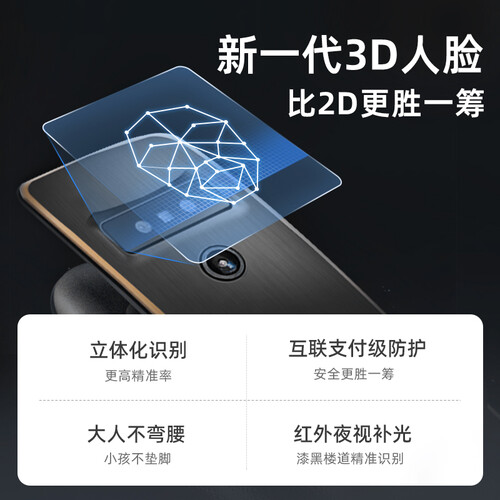 采用3D结构光人脸识别系统,识别速度只城0.5秒,不用动手也能轻松入户。有防撬感应装置,全天监测报警,守护居家安全。