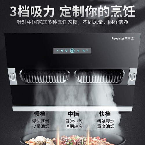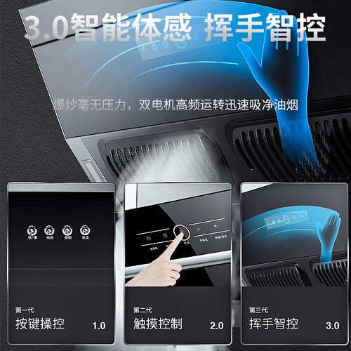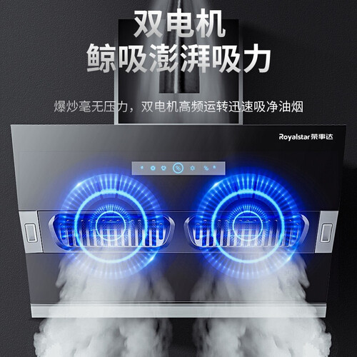 升级双擎降阻电机,吸力倍增,能快速将大量油烟吸干净。双电机模式运行时,产生580Pa负压,爆炒刚刚升腾起的油烟立刻干净。