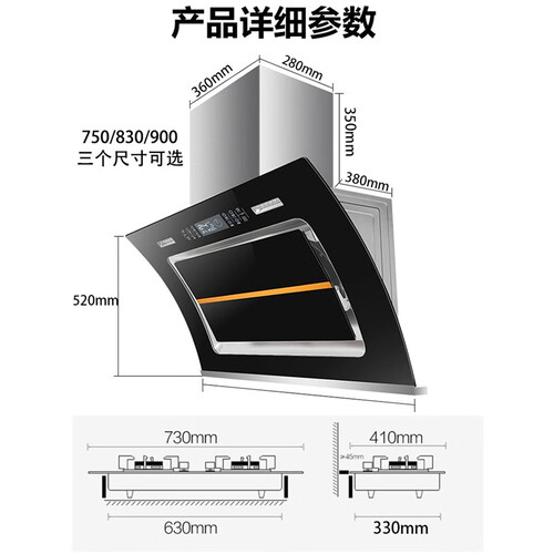 采用八键触控操作,功能清晰易识别,操控无难度。900mm宽屏拢烟,大面积围剿油烟,减少油烟逃散。