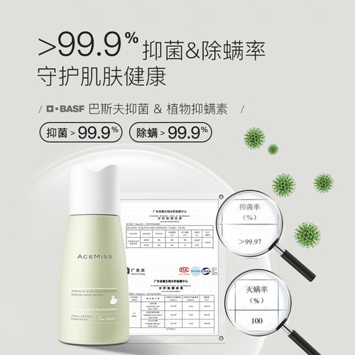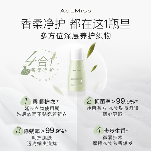 定制级香调,留香时间长达12周,含有柔顺因子,深入衣物纤维,柔软织物,洗后不僵硬;巴斯夫抑菌,守护家人穿衣健康。