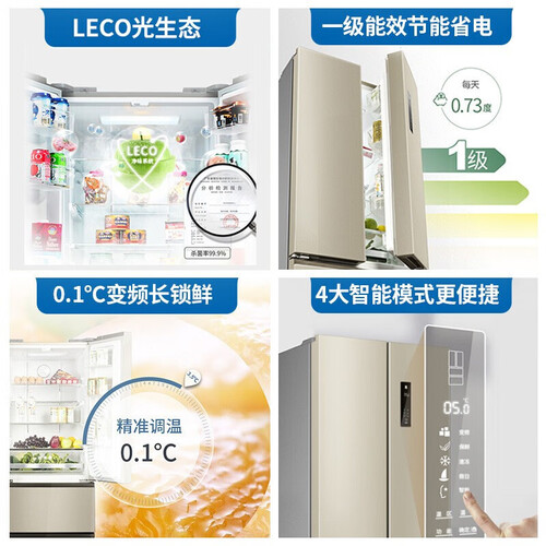 光触媒保鲜技术,紫外线保鲜除味,冰箱腔内更清新。0.1度变频保鲜,有效减少温度波动,长效恒温保鲜,智享生活。