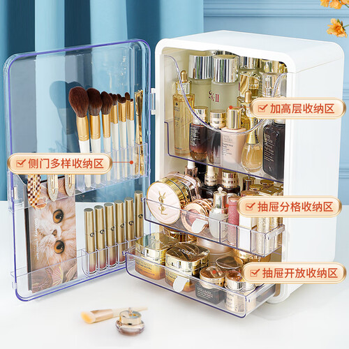 超大容量收纳多种物品,清晰分区收纳,拿取方便,呵护你每一件物品。密封防尘,两种拿取方式,顶层置物不卡收,大角度开合。
