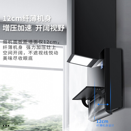 纤薄机身设计,增压加速,烹饪视野广,高个子下厨不碰头。直流变频电机搭配高速芯片,飓风吸力滚滚浓烟一排就净,还您清新厨房。