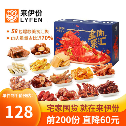 这款礼盒含有58包美味的肉肉,让你一次吃爽。含有川香牛肉条、猪肉脯,烧烤味的牛板筋,虎皮鸡爪等各种美味,满足味蕾。