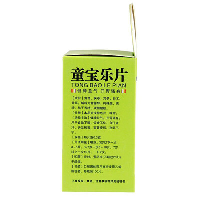 100片/盒,采用黄芪、茯苓、党参、白术、甘草五种中药配比而成,辅料枸缘酸等。咀嚼服用,适用于饮食不化,食欲不振。